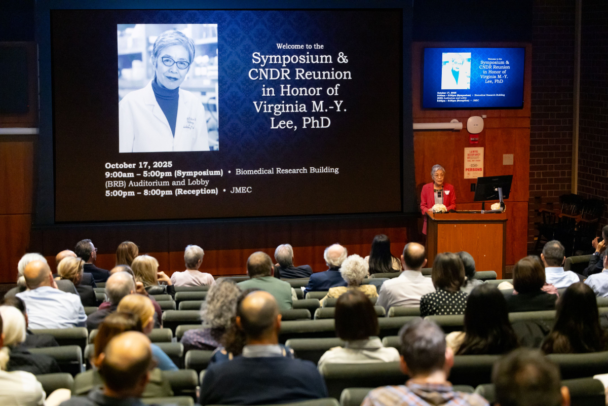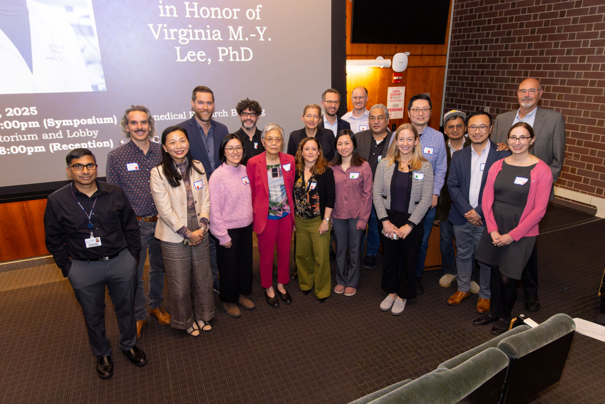 On Friday, October 17, 2025, over 50 former trainees gathered with colleagues, friends, and family to honor Virginia M.Y. Lee, the John H. Ware III Endowed Professor in Alzheimer’s Research, at a daylong symposium held in the Biomedical Research Building. Trainee speakers highlighted the scientific eras of Dr. Lee’s storied career, which has included foundational discoveries on the role of multiple disease proteins in neurodegeneration. Together with her husband and scientific collaborator, the late John Q. Trojanowski, Dr. Lee discovered in the 1990s that neurofibrillary tangles found in the brains of individuals with Alzheimer’s disease were composed of an abnormally phosphorylated form of the protein tau. This discovery was followed by their 2000’s discovery that a protein named TDP-43 was the building block of the disease-defining ubiquitinated inclusions of frontotemporal dementia and amyotrophic lateral sclerosis. The 2010s saw Dr. Lee’s research group demonstrating that the cell-to-cell transmission of alpha-synuclein pathology was possible and might in fact underlie the progression of Parkinson’s disease.